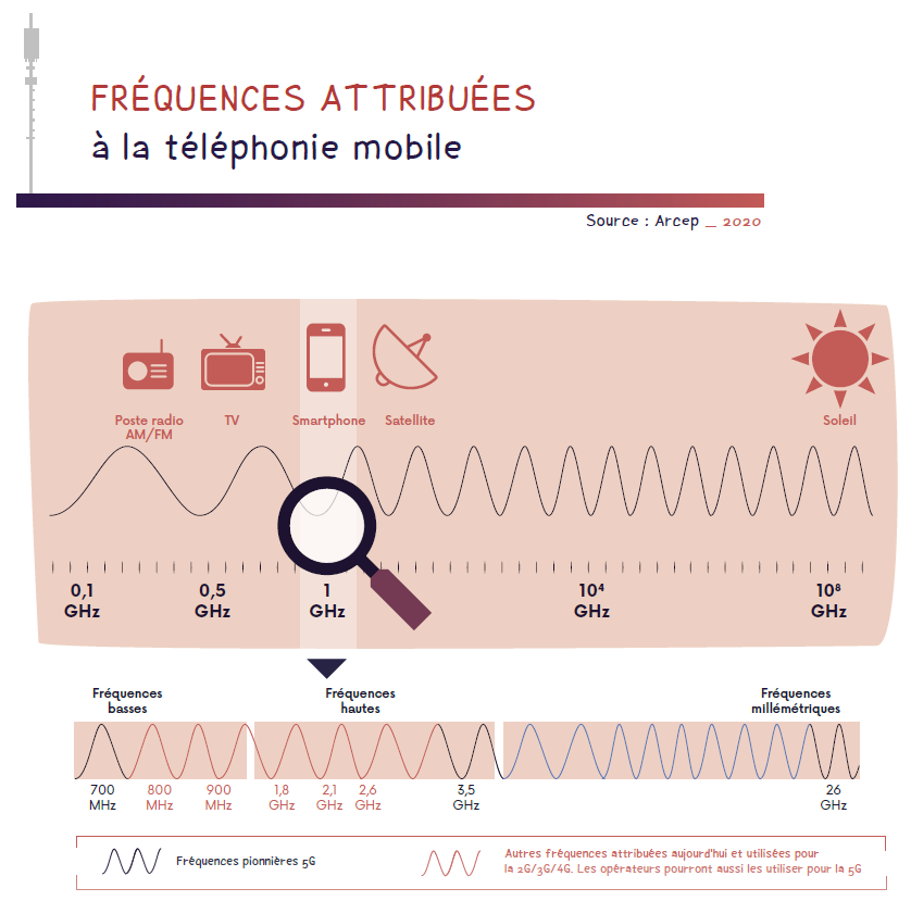 Les réseaux mobiles se caractérisent par la possibilité pour les utilisateurs de connecter leurs terminaux (téléphones mobiles, smartphones) directement aux antennes des opérateurs par l’utilisation d’ondes (ou fréquences) radio. L’Arcep autorise les opérateurs mobiles (et donc leurs clients) à utiliser des fréquences radio sur lesquelles ils font fonctionner leurs réseaux 2G, 3G et 4G.